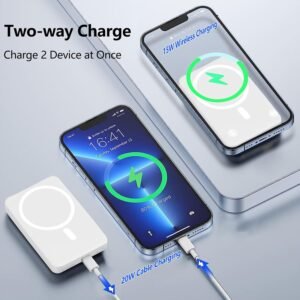 - 【5000mAh Capacity&Strong Magnetic】The wireless power bank has a large capacity of 5000mAh and a USB-C port of 20W input/output. Equipped with strong magnetic that firmly attach to the back of your phone and supports mag-safe wireless charging. You can charge 2 devices at the same time, or share with your best friends or families. 5000mAh small battery charger is just right for you, to be your phone’s second battery pack.